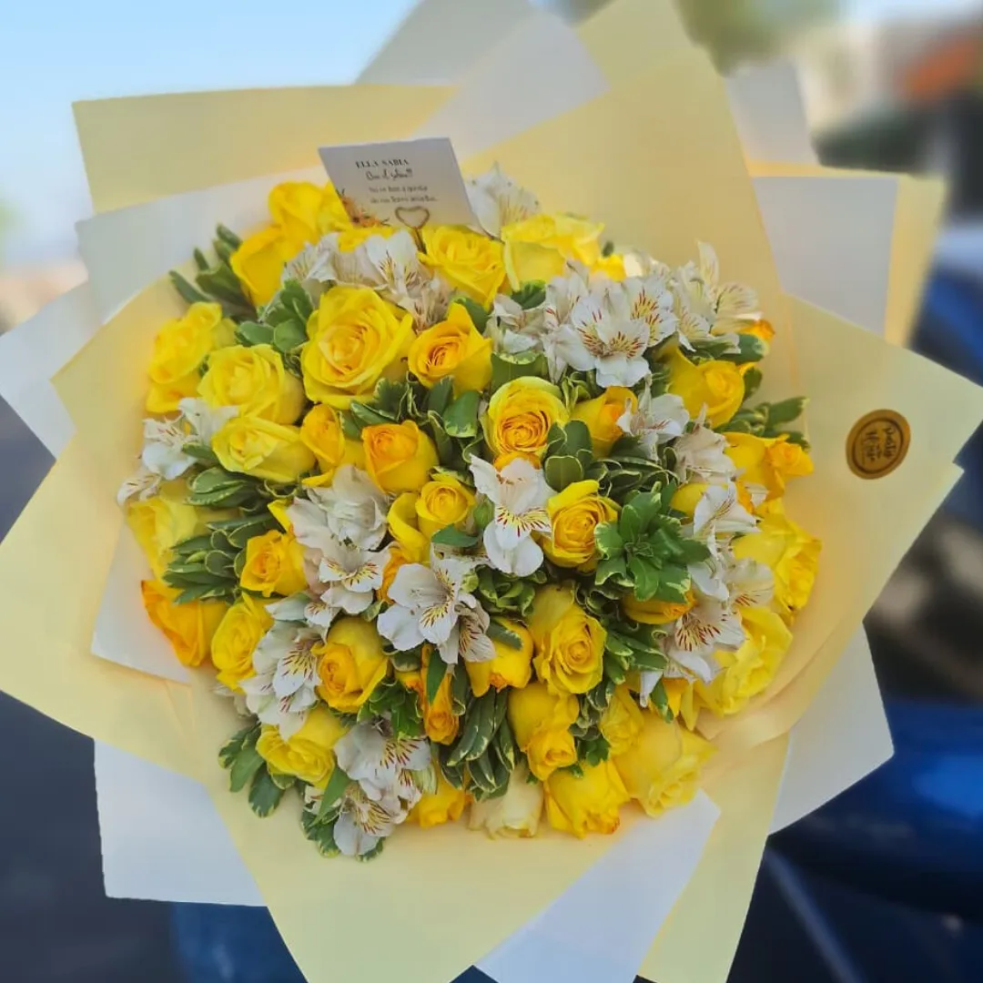 Una explosión de luz y elegancia. Este hermoso ramo tipo buchón combina la calidez de las rosas amarillas con la delicadeza de las astroemelias blancas, creando un detalle floral inolvidable.