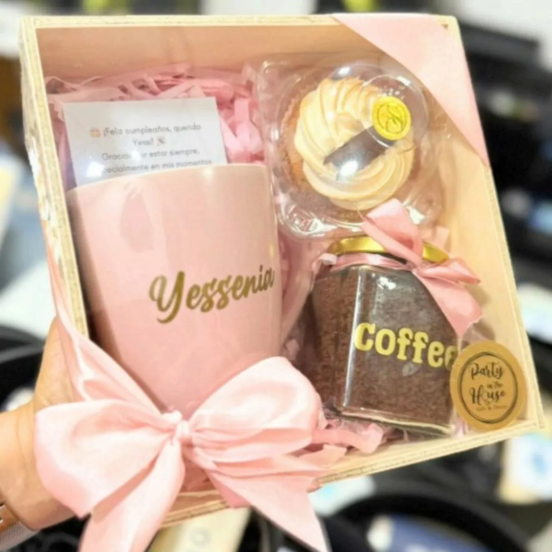 Nuestra Coquette Box incluye una hermosa taza personalizada, una porción de café premium y un cupcake artesanal que conquista a primera vista y aún más al probarlo. Ideal para sorprender a alguien especial (¡o para darte un merecido cariño!), esta caja está diseñada para disfrutar con todos los sentidos. Porque los pequeños detalles hacen grandes momentos.