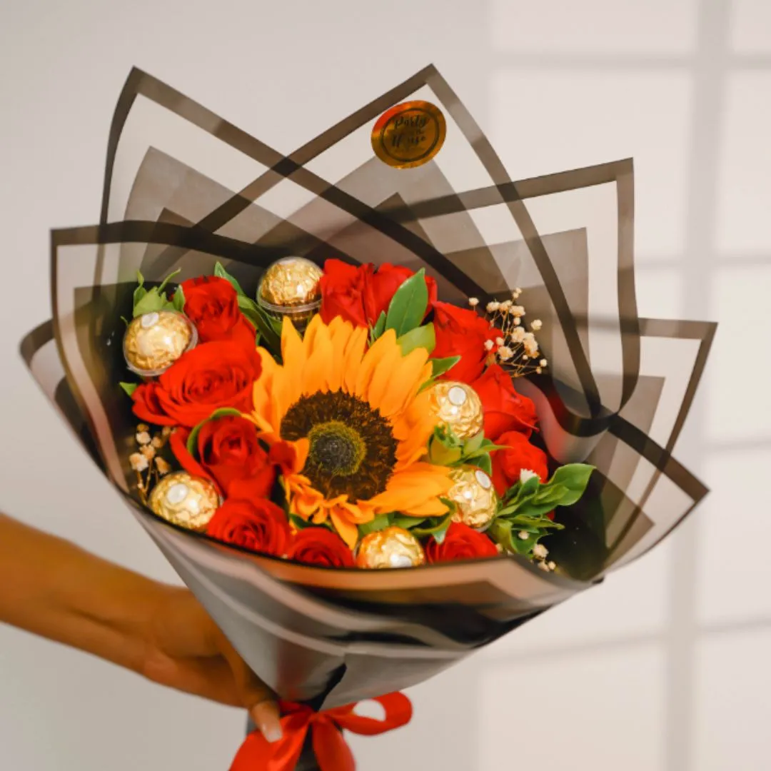 Un detalle único que combina la calidez de un radiante girasol con la elegancia de rosas rojas frescas y el toque irresistible de chocolates premium. Presentado en un envoltorio moderno y elegante que resalta cada color y textura.