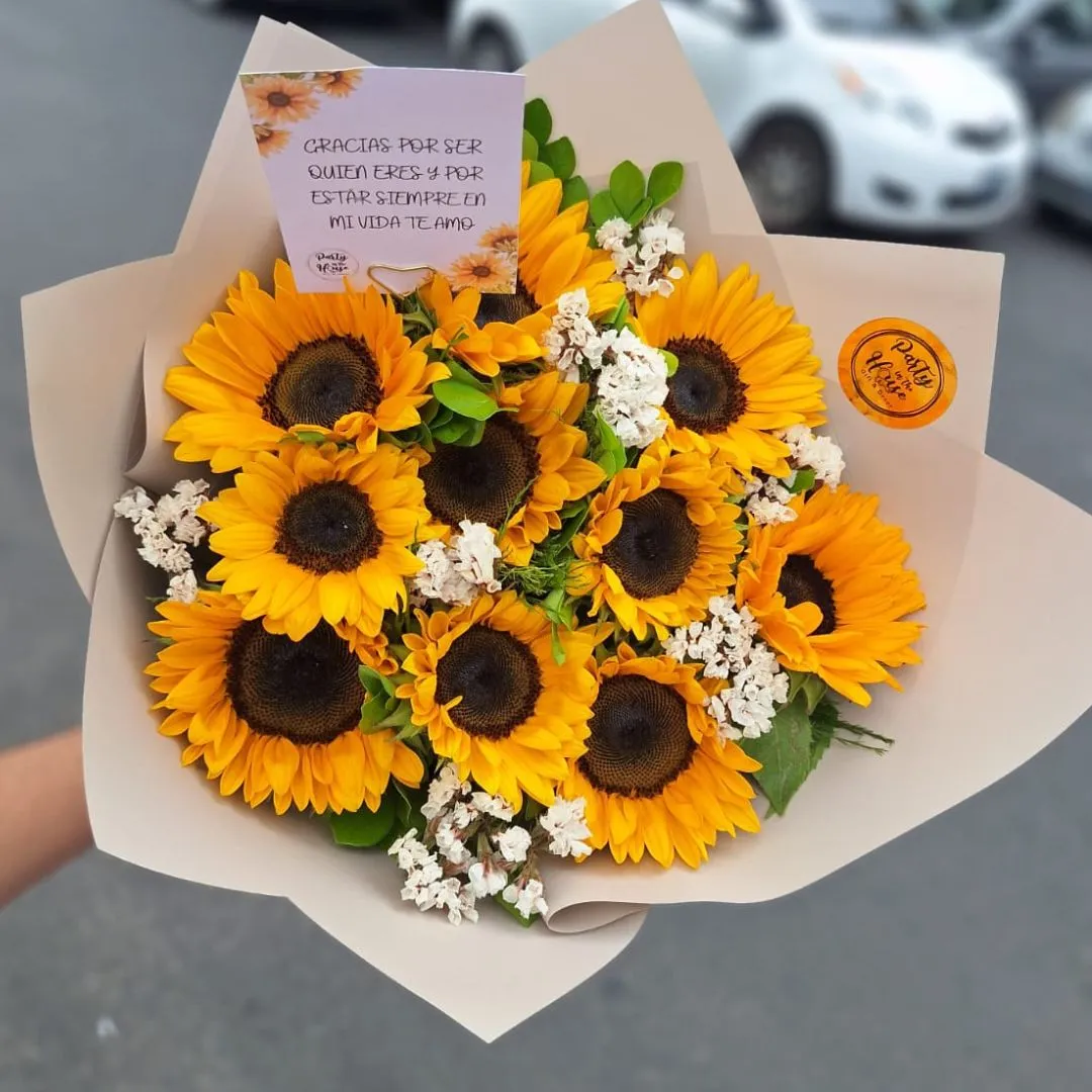 Un hermoso bouquet elaborado con vibrantes girasoles frescos, acompañados de flores blancas delicadas y follaje verde que resalta su brillo natural. Incluye una tarjeta con mensaje especial, ideal para expresar gratitud, amor y alegría.